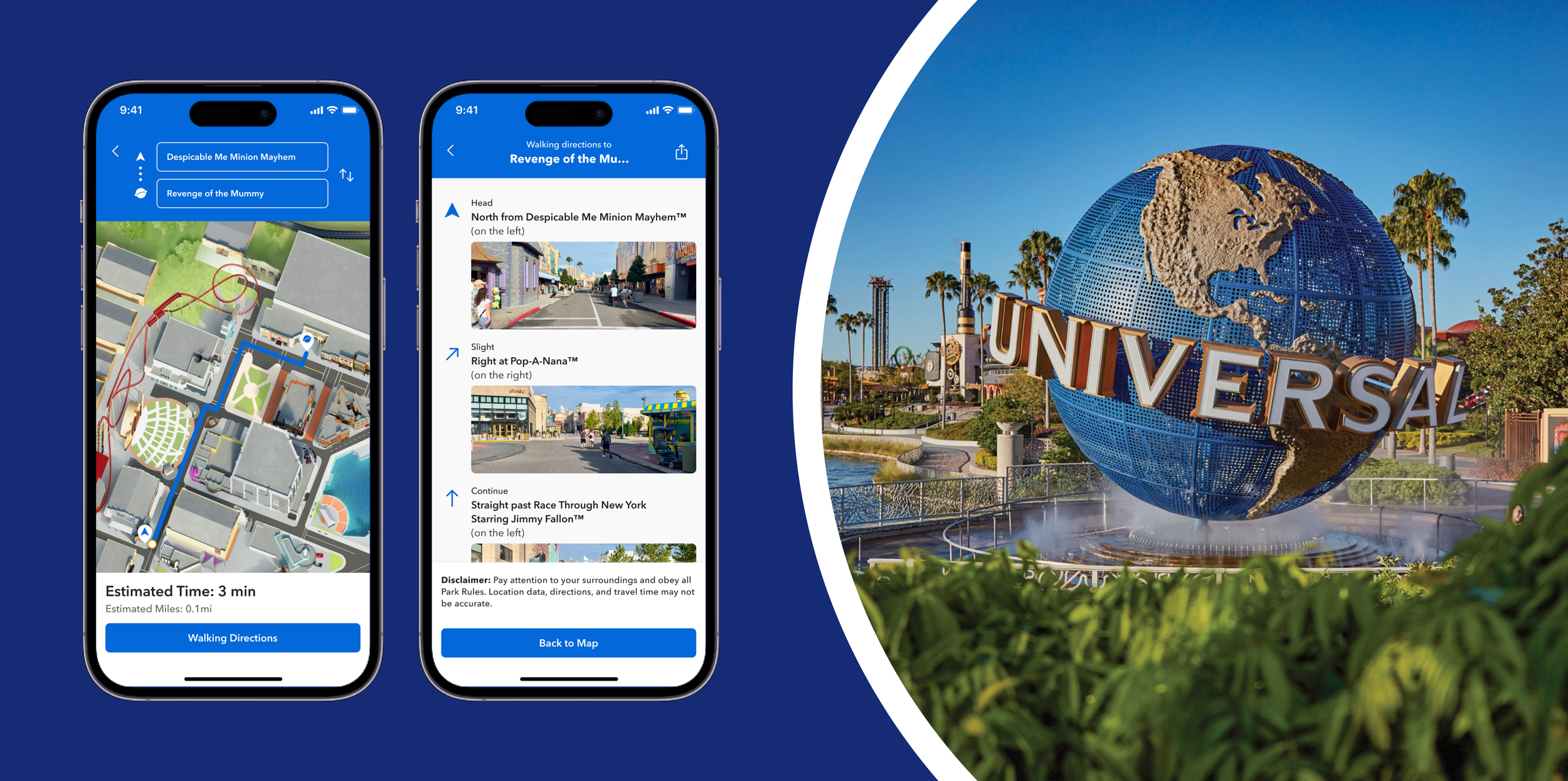 For example, if a user taps on Revenge of the Mummy, they can choose to either view ride info or get walking directions from their current location.