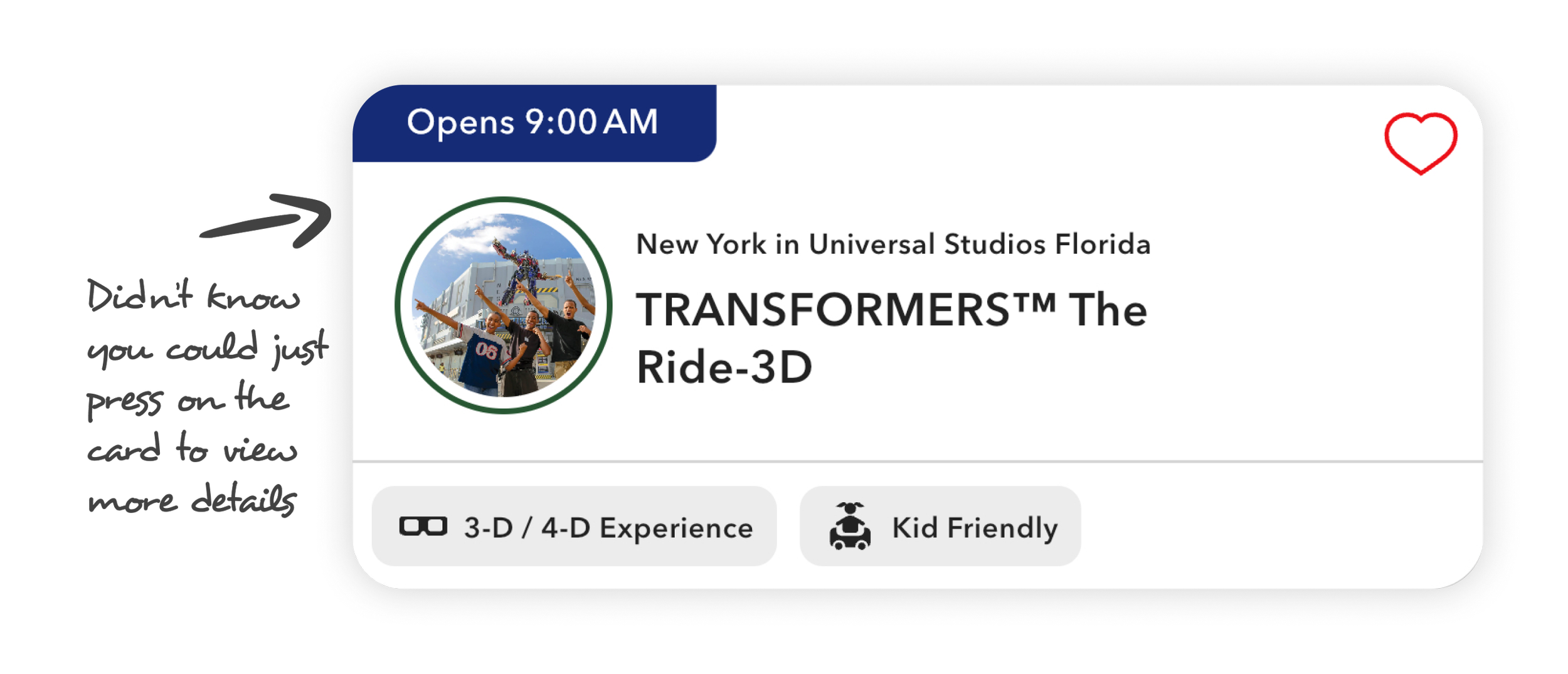 To make this feature easier to access, I also redesigned the attraction cards to include two clear buttons: one for viewing ride details, and one for getting directions right away.